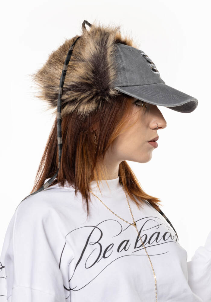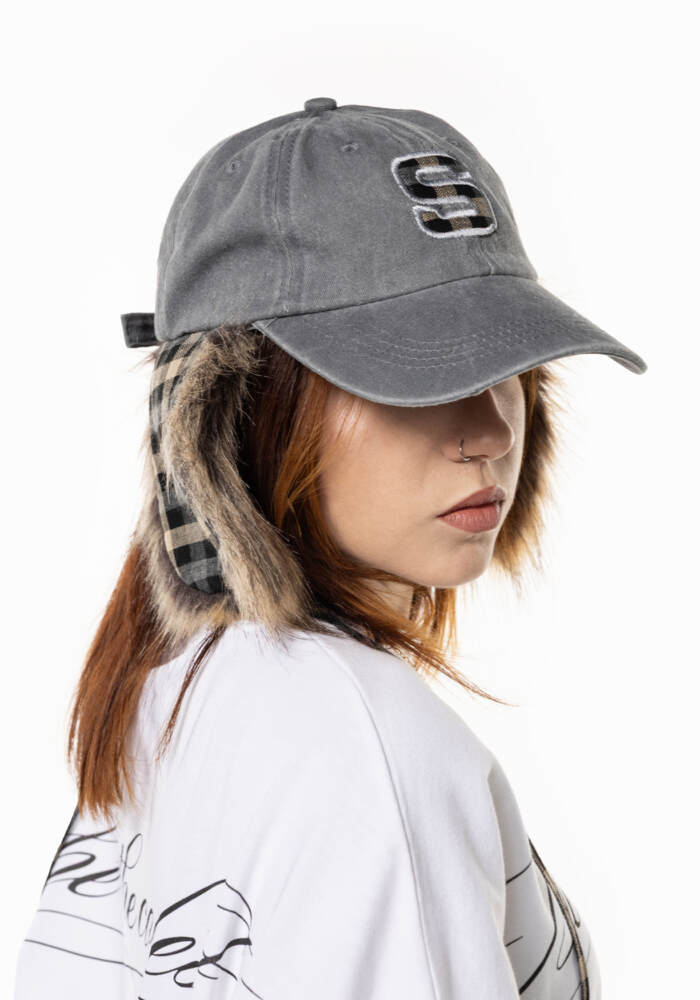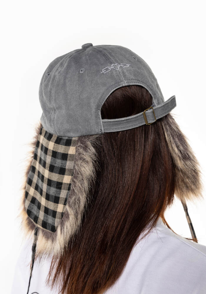 Gorra con orejeras de pelo y estampado de cuadros.