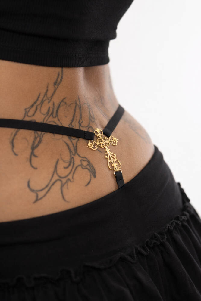 Tanga de punto en color negro con detalle en acero inoxidable.