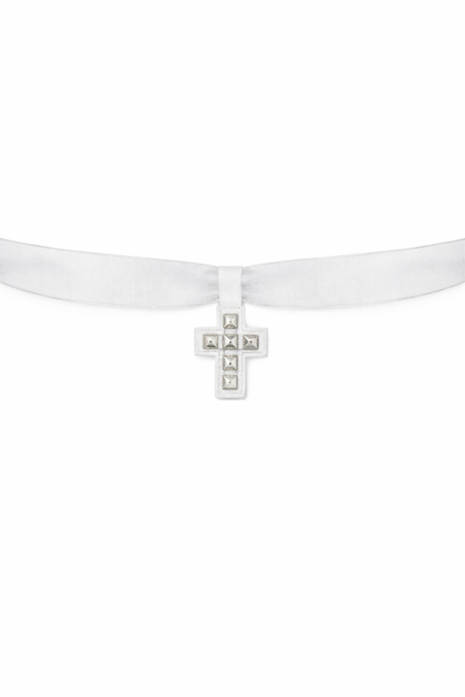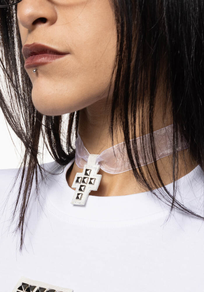 Choker de cinta de organza y detalle de cruz de tachuelas en polipiel.