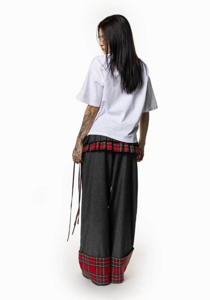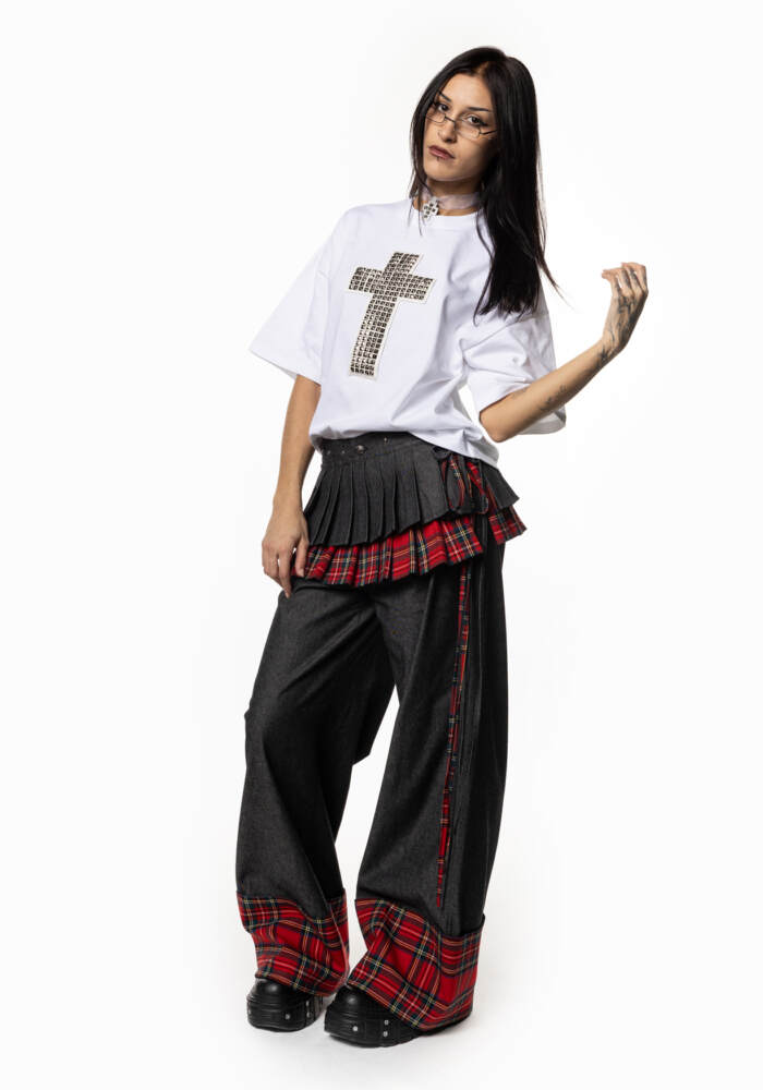 Pantalón vaquero hecho a mano en España con bajo de cuadros y detalle de tachuelas.