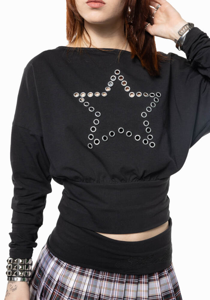 Top de algodón estampado hecho a mano en España con detalle de estrella hecha con eyelets.